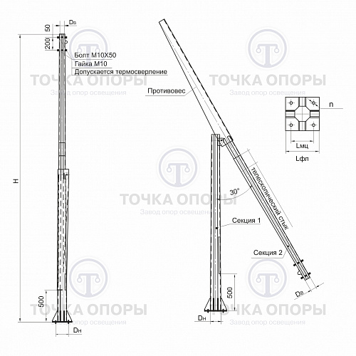 Фланцевая граненая коническая складывающаяся опора ОГКС-25 предназначена для организации систем освещения на автомобильных дорогах, магистралях, а также на территориях, где использование специализированной техники затруднено. Данная конструкция активно применяется на спортивных объектах и участках со сложным рельефом, обеспечивая надежность и удобство монтажа.