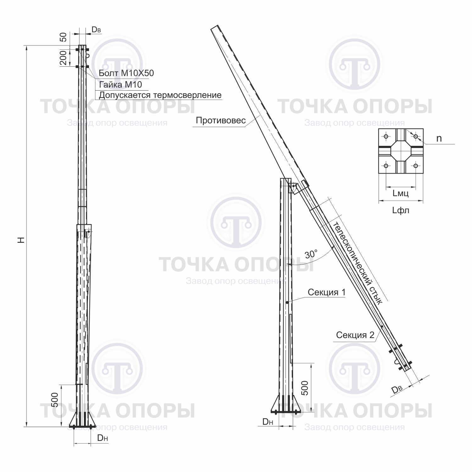 Установка при помощи фланца позволяет легко демонтировать опору освещения для переноса или замены. Крепление опорв П-ФГ к закладной детали производится на уровне земли, при помощи метизов.